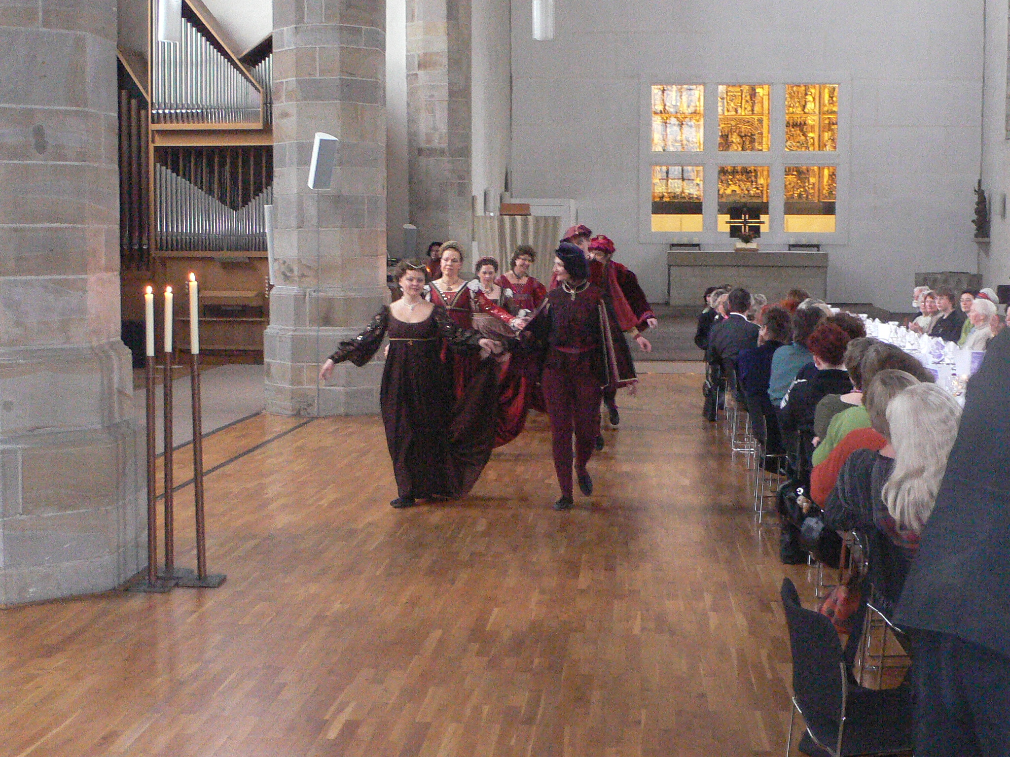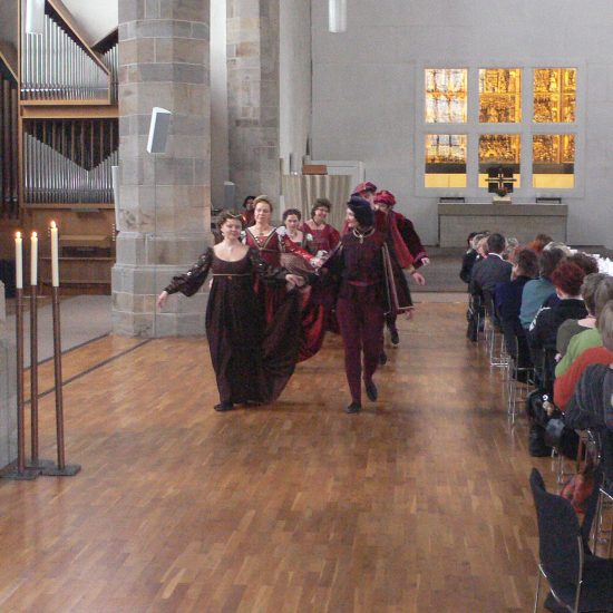 In unserem Repertoire zur Frührenaissance widmen wir uns den italienischen Basse danze und Balli, wie sie an den Höfen des 15. Jahrhunderts zelebriert wurden. Diese Tänze zeichnen sich durch fließende, gleitende Bewegungen aus, die durch die damals üblichen langen Gewand-Schleppen stilistisch unterstrichen.